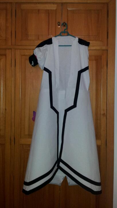 Después empece con el vestido rosa que lleva Madoka, la verdad que no me convencía nada el color de telas que habia por aquí, además que tenía que hacer el degradado a la falda/flor así que decidí que lo mejor era teñirlo todo. Con retales que me habían sobrado de tela blanca hice la parte de delante y la de detrás. Por primera vez en mi vida hice los patrones con periódico y lo pasé a tela. Sorprendente, quedó bien a la segunda jajajaa. La verdad que estoy contenta con el resultado! (En las fotos está sin teñir aun.)