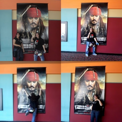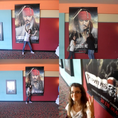 En cuanto los vi, me extrañe que no hubiera una de Johnny Depp, si habia una pero en otro sitio xD. El chico de las taquilla seguro flipo con nosotras, pero bueno, despues de tomarnos fotos con la calavera gigante, nos fuimos directas al poster gigante de Jack Sparrow y yo como una imbecil, cuando estaba a unos metros, lo señale y grite: "Jack Sparrow!". Corri y salte encima del poster literalmente xDD, me "estampe" contra la pared y nos empezamos a reir como idiotas XDDDD!!! Fue muy LOL todo. Despues de eso, nos hicimos algunas fotos con el poster xDDD.