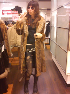 Después de eso, fuimos a dar una vuelta por la tienda de mujeres esa y chan!! Me fui a la sección mas cara a mirar los vestidos, porque uno me gusto y fui directamente, vi el precio y me muri >.< xDDD. Miramos vestidos que eran muy extraños que tenia tul rasposo y extraño y después vimos abrigos de piel!!! No pudimos resistirnos y Yumi se probo uno.