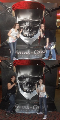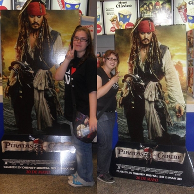 En cuanto los vi, me extrañe que no hubiera una de Johnny Depp, si habia una pero en otro sitio xD. El chico de las taquilla seguro flipo con nosotras, pero bueno, despues de tomarnos fotos con la calavera gigante, nos fuimos directas al poster gigante de Jack Sparrow y yo como una imbecil, cuando estaba a unos metros, lo señale y grite: "Jack Sparrow!". Corri y salte encima del poster literalmente xDD, me "estampe" contra la pared y nos empezamos a reir como idiotas XDDDD!!! Fue muy LOL todo. Despues de eso, nos hicimos algunas fotos con el poster xDDD.